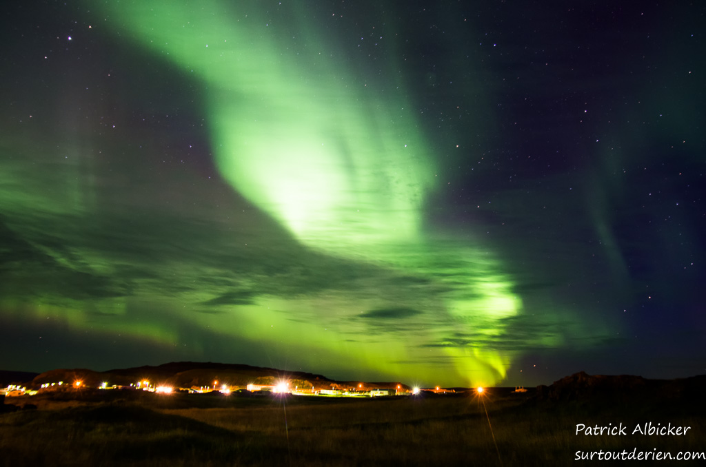 Le camping est situé un peu en hauteur au dessus du port, la nuit sera bercée par le bruit continu des moteurs du chalutier en contre bas. La chance nous sourit a nouveau, cette nuit les lumières du ciel de minuit dansent encore au dessus de nos têtes.
