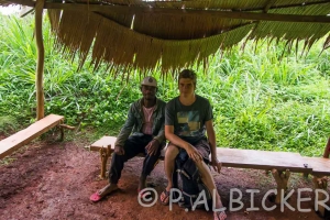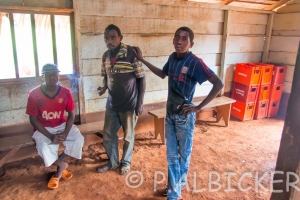 Le second village est un peu plus loin sur la piste, en route on se fait inviter a boire du vin de palme, l’occasion de faire des photos et surtout de les montrer, tout le monde veut voir sa photo… on arrive ensuite dans un grand village, en traversant on se fait alpaguer par quelqu’un qui prétend être un notable du village et représentant du chef de village. Je ne comprendrais pas tout a ce qui se passera pendant l’heure qui suit, d’autres personnes viennent, on me fait assoir sous un abris, visiblement il y a un conflit d’autorité entre celui qui nous a alpagué et ceux qui m’ont fait descendre de moto. Mon chauffeur me dit de ne pas m’inquiéter mais tout de même, je suis entouré de quelques énergumènes qui sont manifestement assez énervé, pour certains passablement alcoolisés et ont quand même des machettes sur eux, bref la situation m’inquiète un peu. Finalement je visite quand même le village, avec les palabres qui continuent autour de moi, il y a une grande réunion pour l’organisation d’une fête a venir, un bar qui passe de la musique a fond, une épicerie et des maisons en terre un peu partout. J’evite les photos, d’une part pour ne pas envenimer la situation vu que les palabres autour de moi sont aussi une question d’argent et ensuite pour ne pas me faire racketter encore plus.