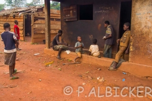 Il faut faire pas mal de route puis des km de piste dans la foret pour rejoindre les villages Pygmées. Dans le premier village je dois d’abord m’adresser au chef du village comme c’est la coutume pour obtenir l’autorisation de visiter et de prendre des photos, les gens sont assez suspicieux de me voir la, on me suspecte surtout de vouloir tirer profit des photos que je fais ce qui est surtout un bon prétexte pour me demander de l’argent, l’autre sujet c’est que je ne serais pas seulement la pour du tourisme mais pour d’autres choses. J’arriverais quand même a visiter le village et prendre des photos, ici tout est une question de discussion et de négociation, cela fait partie du jeu, on m’avait prévenu. Les Pygmées qui vivent ici sont sédentarisés et vivent dans des cases traditionnelles Camerounaises faites de briques de terre ou des cases en béton, seule persiste une case Pygmée faite de branche et de feuilles. On m’explique qu’il y a d’autres cases Pygmées un peu plus loin, en effet certains préfèrent vivre dans leur habitat traditionnel mais on me refusera la visite.