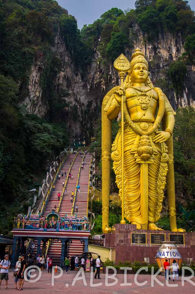 Dans l’immense bloc de calcaire devant moi il y as en réalité plus de 20 grottes connues dont seules 3 ou 4 sont accessibles au public. On accède a la grotte par un monumental escalier gardé par une immense statue, avec la chaleur intenable ici la montée est assez pénible surtout qu’il faut faire attention aux bandes de singes assez agressifs qui n’hésitent pas a voler bouteilles de coca et nourriture directement dans la main des visiteurs !
